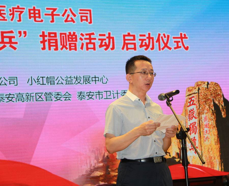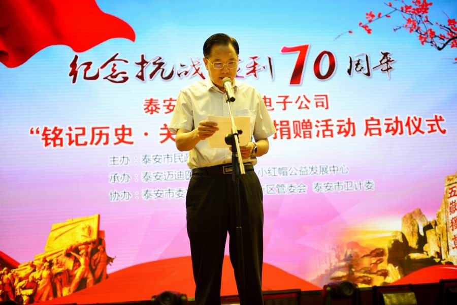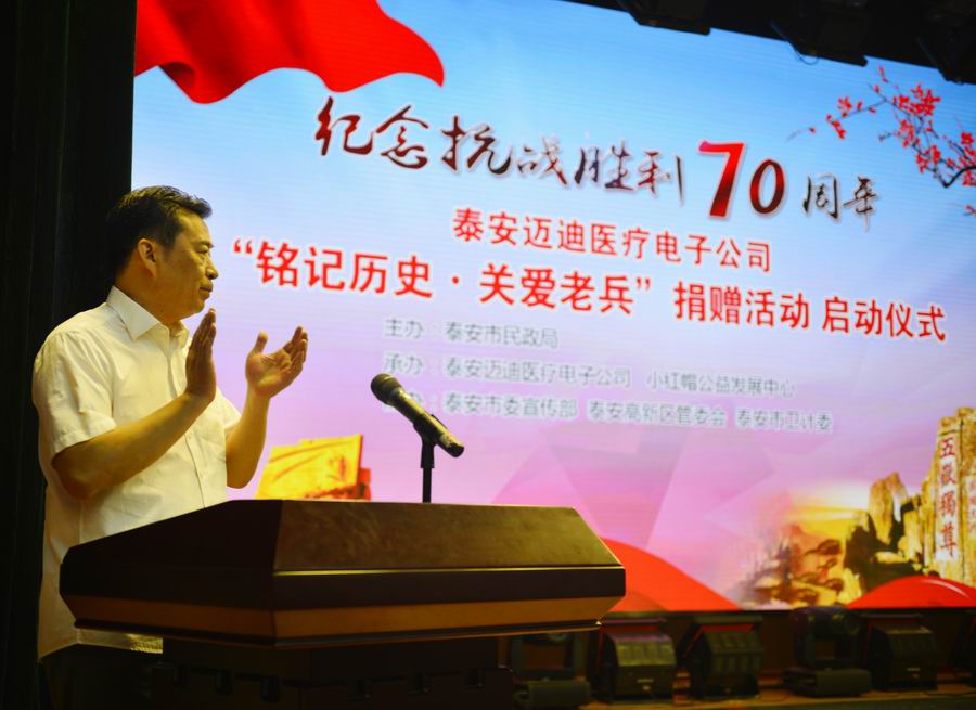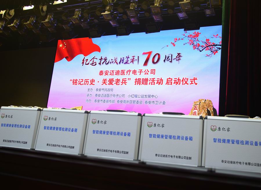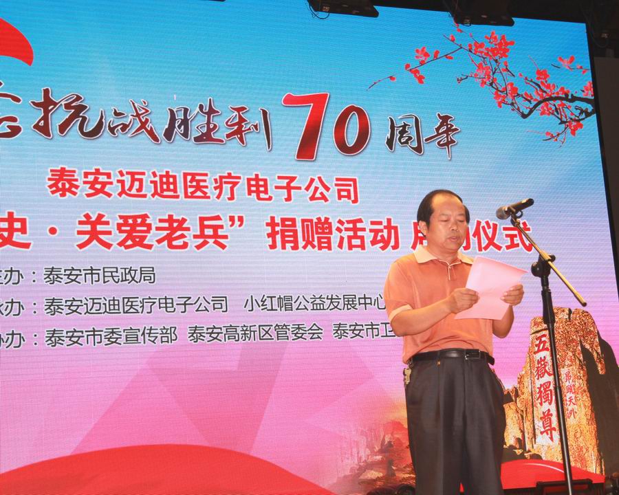 為紀(jì)念抗日戰(zhàn)爭(zhēng)暨世界反法西斯戰(zhàn)爭(zhēng)勝利70周年,弘揚(yáng)抗戰(zhàn)精神,褒揚(yáng)抗戰(zhàn)老戰(zhàn)士,泰安市邁迪醫(yī)療電子有限公司發(fā)展不忘回報(bào)社會(huì),在泰安市民政局的指導(dǎo)下,拿出遠(yuǎn)程家庭健康檢測(cè)產(chǎn)品,為抗戰(zhàn)老兵送愛(ài)心、送健康。 2015年8月24日,在泰安市傳媒集團(tuán)演播大廳,泰安邁迪公司紀(jì)念抗戰(zhàn)勝利70周年“銘記歷史·關(guān)愛(ài)老兵”捐贈(zèng)活動(dòng)啟動(dòng)儀式,在溫暖、熱烈的氣氛下進(jìn)行。泰安市副市長(zhǎng)徐恩虎、泰安市民政局局長(zhǎng)孫蘭俊、副局長(zhǎng)董峰、泰安邁迪公司董事長(zhǎng)范世忠、泰安市小紅帽公益發(fā)展中心主任張煥慶,以及縣市區(qū)、景區(qū)優(yōu)撫單位代表、社會(huì)愛(ài)心人士和廣大志愿者200余人參加。市委副秘書(shū)長(zhǎng)于文龍主持儀式。
